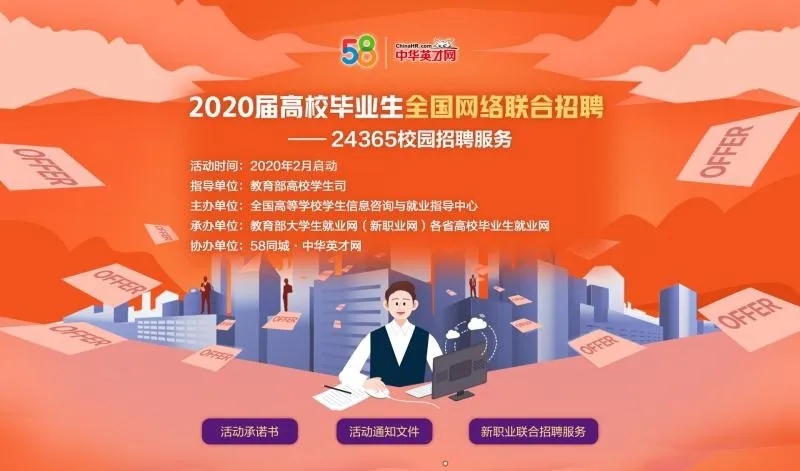为贯彻落实习近平总书记在统筹推进新冠肺炎疫情防控和经济社会发展工作部署会议上的重要讲话及系列指示批示精神,认真落实国务院常务会关于鼓励吸纳高校毕业生就业的工作部署,2月28日,教育部启动“2020届高校毕业生全国网络联合招聘——24365校园招聘服务”活动,为高校毕业生提供每天24小时全年365天的网上校园招聘服务,毕业生可登录活动平台(www.ncss.cn)及各有关网站专栏参加求职招聘。