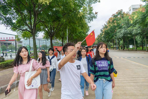 班助挥舞小国旗讲解校园