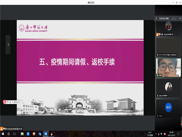 为做好毕业生的毕业工作与安全工作,督促学生学习新思想,争做新青年,6月10日晚,数学与统计学院2017级本科生通过腾讯会议召开线上年级会。会议由年级辅导员高磊老师、兼职辅导员李欣欣老师主持,310名同学在线参加会议。