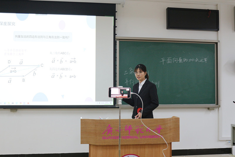 本次师范生教学技能大赛由教学设计、模拟上课和板书三个环节组成,8名进入决赛的选手围绕“二次函数与一元二次不等式”、“向量的加法运算”、“余弦定理”、“古典概型”等知识提前2个小时开展备课,并进行10分钟的现场模拟授课和回答评委提问。桂林市教育科学研究所正高级教研员马恩荣从教学分析、学科核心素养培育、教学重难点把握等方面对选手的表现进行点评,他强调,在教学设计环节要做到活用教材,不拘泥于某一版本的教材,要结合学情和教学目标创设合理的教学情境,把握教学重难点,落实有效课堂的建设。