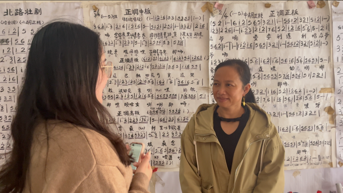 团队成员通过探寻壮戏足迹,实地走访,与当地壮戏传承人和传播壮戏青年的深入交谈的方式,了解壮戏的传承历程以及未来发展路径,学习壮戏传统文化,为实现乡村振兴与非遗文化壮剧传承与发展的良性互动。团队成员在调研中换上戏服,编造发型,学习北路壮剧简单的舞台动作,真切地感受壮剧的魅力。团队成员还来到田林县壮剧文化中心参观,进一步了解该艺术文化的发展情况。团队成员还采访了抖音“田林文化宣传”账号的博主罗梦祥,该博主拥有粉丝7000多,账号日常主要宣传田林各地的壮戏剧目以及山歌等,了解新媒体环境对于民族传统艺术文化的传承与发展效果。