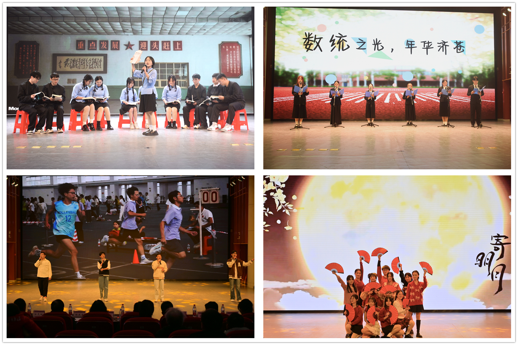 在表彰环节,3个榜样事件、2个榜样团队和19名榜样个人接受表彰,学院领导、嘉宾为他们颁奖。表彰现场还举行了退休教师荣休仪式,颁发了“99数本院友”助学金、袁鼎荣助学金和院友奖学金。学院党委负责人、行政负责人现场接受社会爱心人士分别捐赠的50000元和16000元爱心助学善款,将用于在学院设立奖助学金。在文艺表演中,学生原创的院史剧《我与数统同奋进》再次搬上舞台,原创音画诗《数统之光,年华济苍》赢得全场阵阵掌声。《我们的明天》《我的大学式》《寄明月》等节目载歌载舞,给师生带来了视觉盛宴。