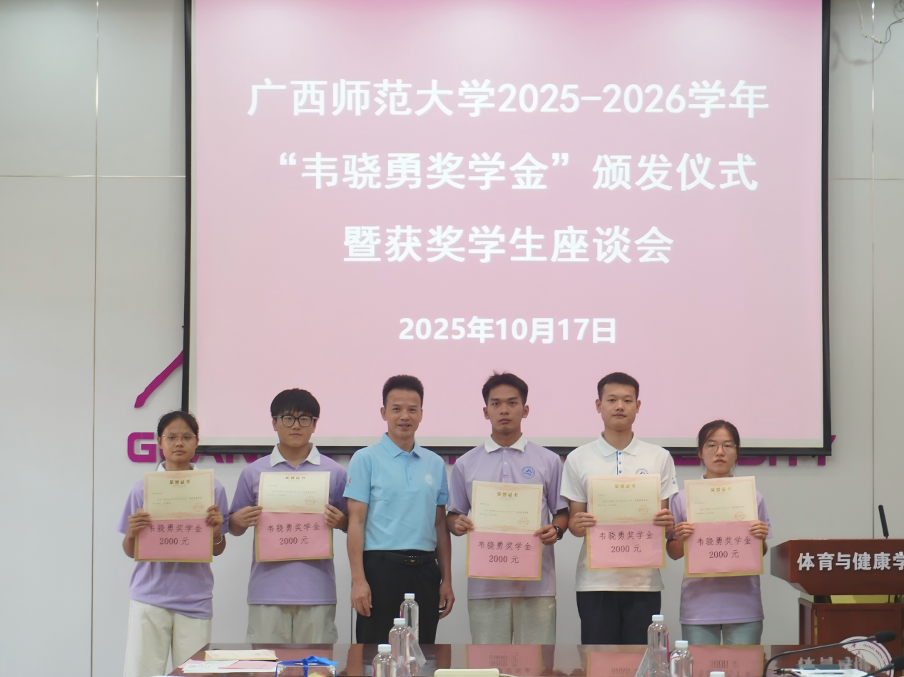 10月17日下午,数学与统计学院和体育与健康学院在雁山校区体育楼516会议室举行广西师范大学2025-2026学年“韦骁勇奖学金”颁发仪式暨获奖学生座谈会。广西师范大学深圳校友会会长、广西高校深圳校友联盟联席主席韦骁勇,数学与统计学院党委负责人及其他相关负责人,体育与健康学院党政负责人,本次奖学金获奖学生参加了此次座谈会。