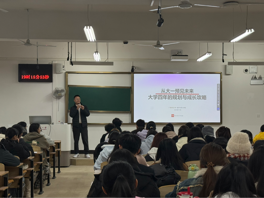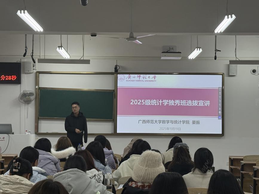 为深化拔尖创新人才培养模式改革,吸引和选拔具备浓厚学术兴趣与发展潜力的学子,数学与统计学院于11月19日晚在理三506教室举行了统计学独秀班选拔宣讲活动,活动由学院行政相关负责人主持,学院2025级统计学、信息与计算科学专业学生参加。