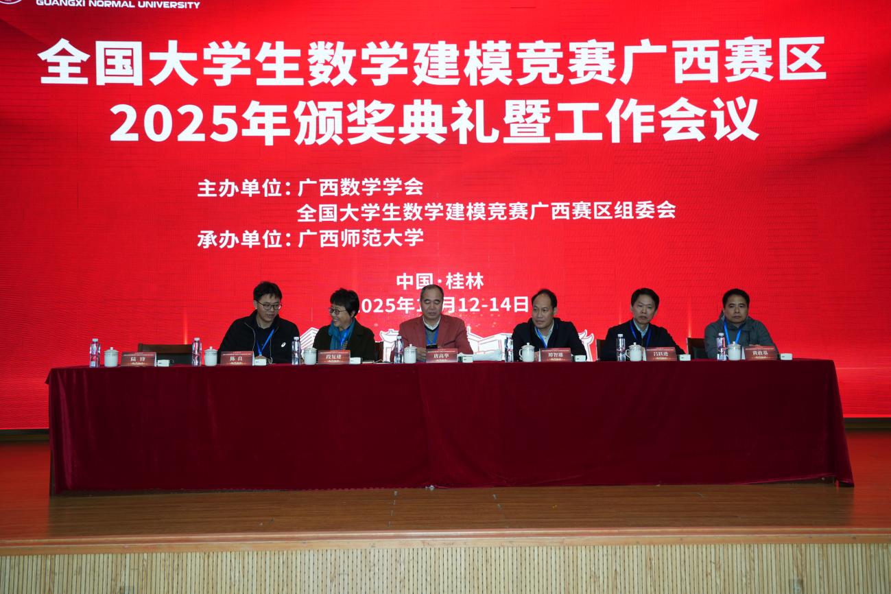 12月13日,全国大学生数学建模竞赛广西赛区2025年颁奖典礼暨工作会议在广西师范大学举行。广西数学会理事长、北部湾大学原党委副书记唐高华,广西师范大学党委常委、组织部部长谭智雄,以及广西赛区组委会多位成员出席活动。
