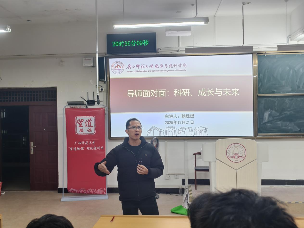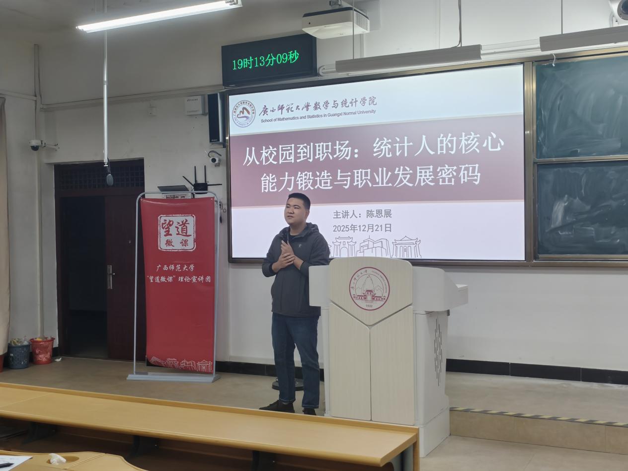 12月21日晚,数学与统计学院在雁山校区理四304教室举办以《从校园到职场:统计人的核心能力锻造》为主题的“望道微课”理论宣讲,邀请了学院2024届统计专业校友陈恩展(现任中国移动桂林分公司产品经理)与其硕士研究生导师赖廷煜共同主讲,辅导员代表、研究生及本科生代表参与。