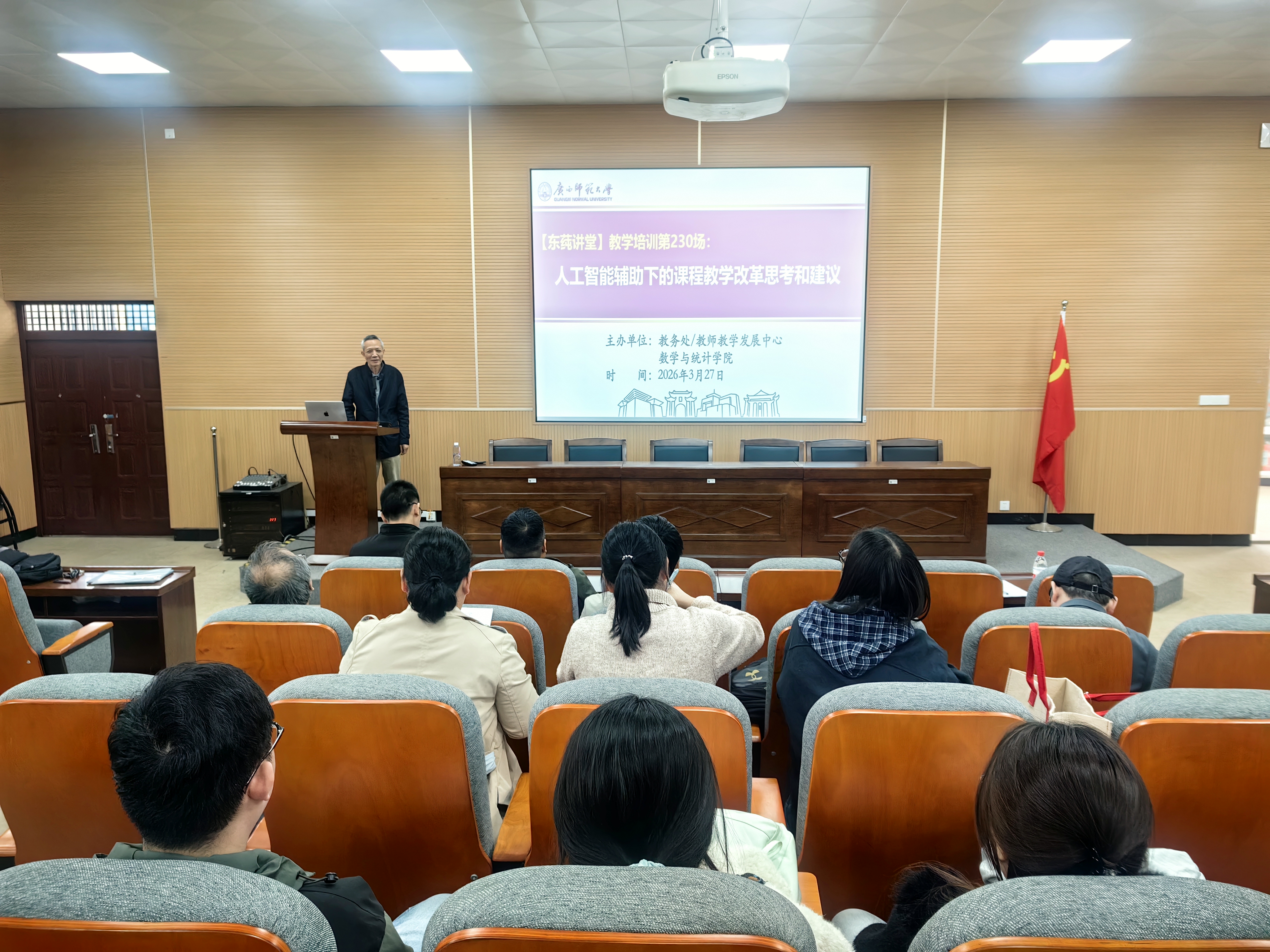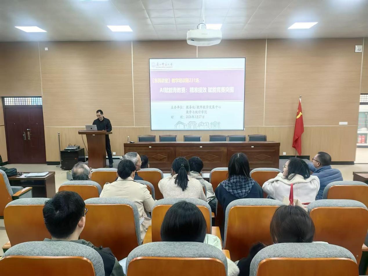 3月27日下午,由教师教学发展中心、数学与统计学院联合主办的2场“东莼讲堂”在雁山校区厚藩楼理四501教室举行。本次活动围绕人工智能赋能教学展开,分别聚焦课程教学改革与青年教师教学竞赛提升两大主题。