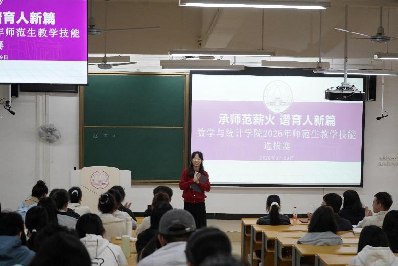 为提升我院全体师范生的教学技能水平,选拔优秀选手参加2026年度广西师范大学师范生教学技能大赛,3月29日,由数学与统计学院团委主办、教师职业技能协会承办的“承师范薪火,谱育人新篇”师范生教学技能比赛在我校雁山校区理科楼四区403教室隆重举行,本次竞赛是学院“智慧杯”师范生系列技能活动的一个环节。